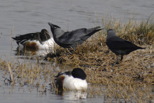 Ci-dessus : choucas s'abreuvant en compagnie de canards souchets